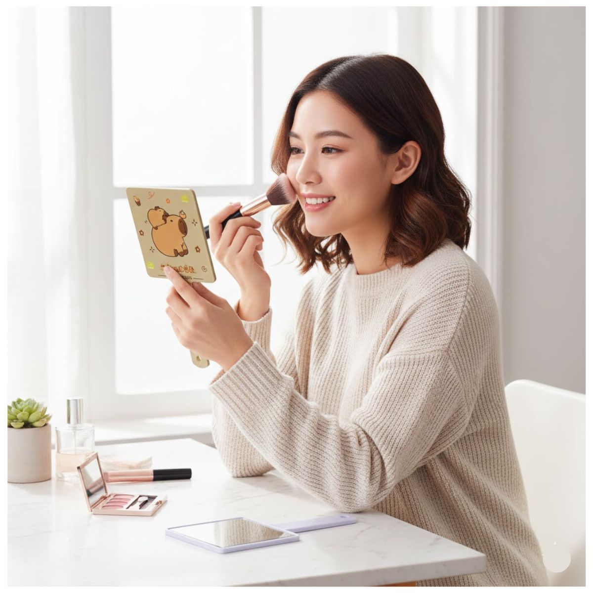 ¡Añade un toque tierno a tu rutina de belleza! Este Espejo Forma Cuadrada de Mano Capybaras captura la esencia del popular, con un diseño adorable, siendo funcional. Su forma de cuadrada y el color beige vibrante lo convierten en el accesorio de moda perfecto para los fans. Es ideal para llevar contigo, te puedes retocar tu maquillaje en cualquier lugar.